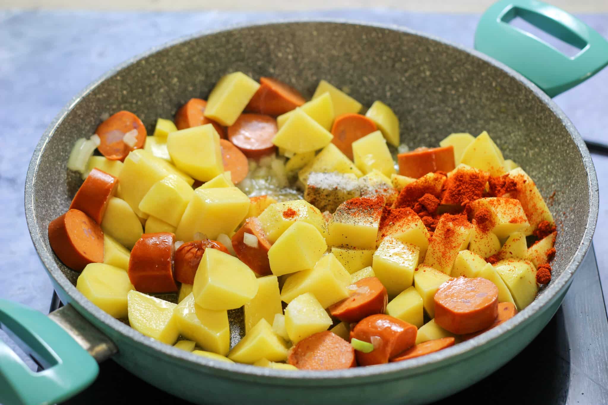 - Stir in the diced sausages and diced potatoes.