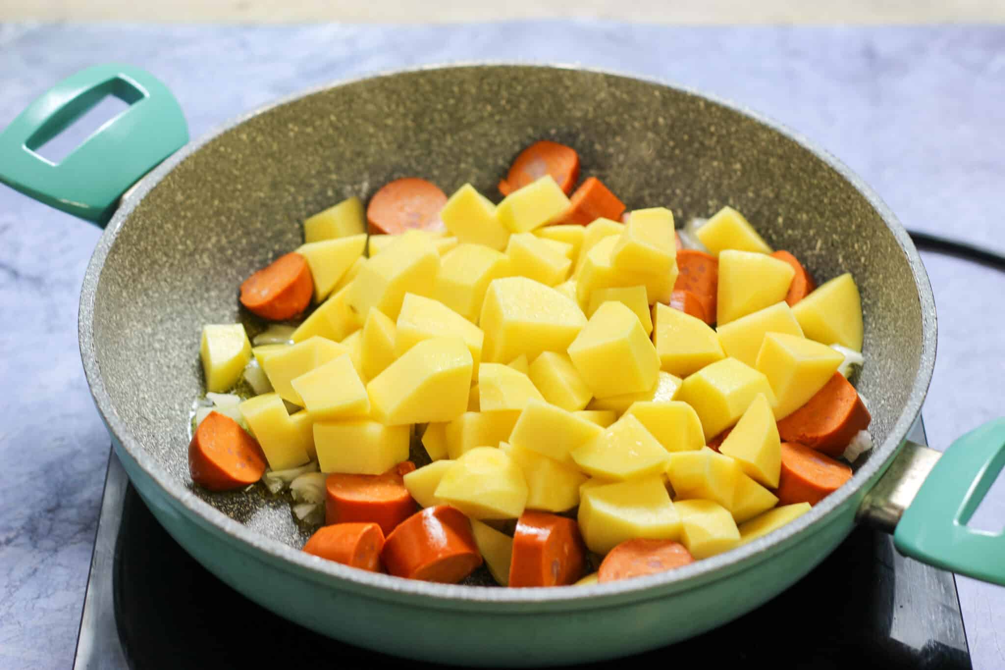 So, take a pan and heat it over medium flame. Add warm olive oil, and then cook the diced onion. After some time, add diced potatoes and sausages. Let everything cook for a while.