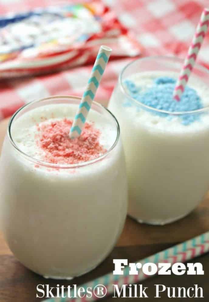 Blend 1/4 cup of 1 color Skittles® granules, milk, simple syrup and ice cream in blender for 10 to 20 seconds